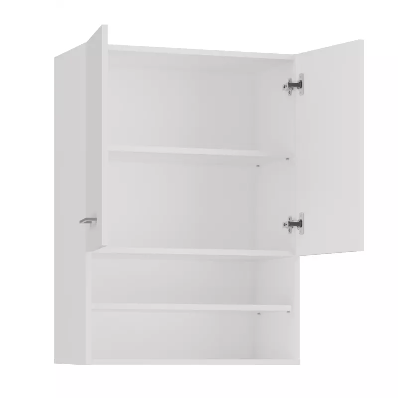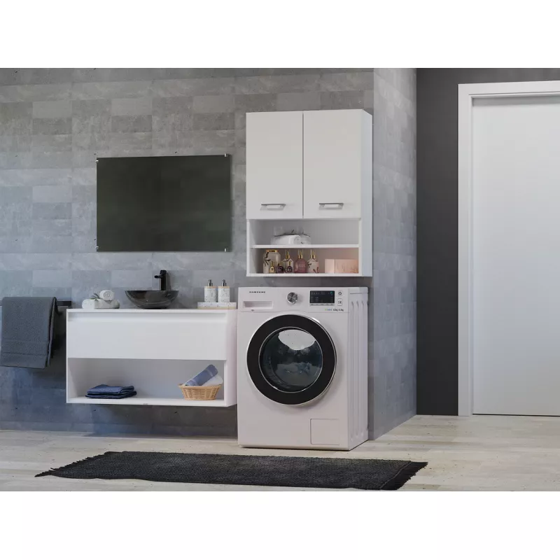 Der Bad-Hängeschrank RISTO 2 löst den Platzmangel im Badezimmer, indem er den freien Raum über der Waschmaschine effektiv nutzt. Hinter der Schranktür befinden sich geräumige Regalböden, die zur Aufbewahrung von Waschmitteln und Handtüchern genutzt werden können, während die offenen Regalböden zur Präsentation von Kosmetika dienen können.