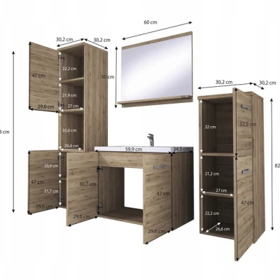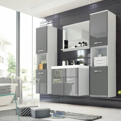 Die Badezimmerschränke MIKSA bestehen aus hochwertigen Materialien, die kratzfest und feuchtigkeitsbeständig sind. Beinhaltet: Regal, Schrank, Spiegel mit Regal, Waschbeckenunterschrank und Waschbecken.