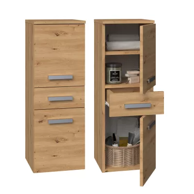 Der niedrige Badezimmerschrank ATSO ist mit einer praktischen Schublade und 2 Schränkchen ausgestattet. Dank seiner Abmessungen nimmt der Schrank nicht viel Platz ein, weshalb er auch für kleinere Badezimmer geeignet ist.