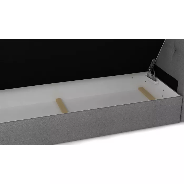 Das Bett verfügt über einen Stauraum, einen Lattenrost und eine Matratze. Weiter unten können Sie optional einen Topper dazukaufen.