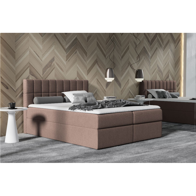 Das dominierende Element des Bettes KATE ist das hohe Kopfteil im modernen Design. Das Bett verfügt über einen Lattenrost und eine integrierte Bonell-Federkernmatratze, gefüllt mit T30-Schaum. Der hochflexible Schaumstoff-Topper sorgt für Komfort und Bequemlichkeit beim Ausruhen. Der seitlich zu öffnende Stauraum befindet sich unter den Matratzen. Möglichkeit der Wahl der Größe der Liegefläche und der Farbe der Polsterung.