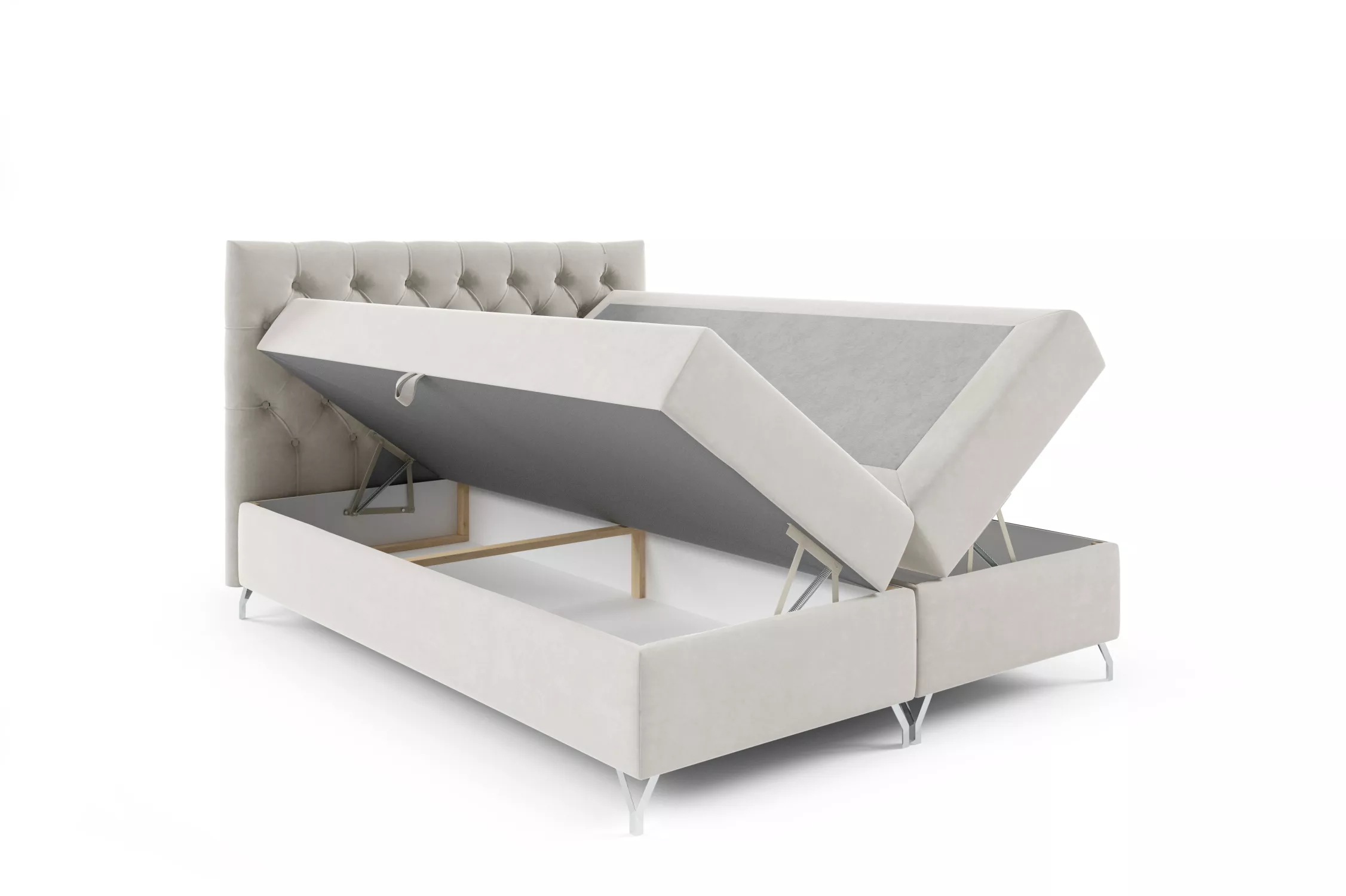 Das luxuriöse Boxspringbett SHANNON steht für Komfort. Das gesteppte Kopfteil sorgt für bequemes Anlehnen beim Lesen, die zeitlose Eleganz wird durch hohe Holzbeine unterstrichen.