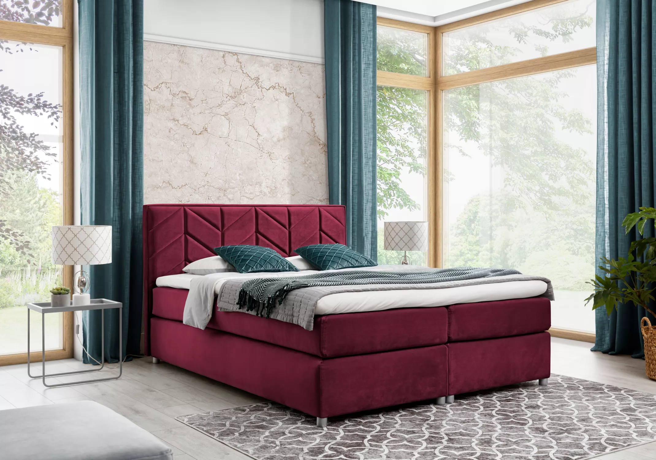Polsterbett GALINA – 200x200, Bordeauxrot + GRATIS Topper