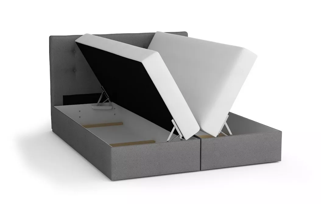 Das Boxspringbett ANGELES eignet sich für alle modernen Schlafzimmer. Das gepolsterte Kopfteil verhindert ein Verkratzen und Verschmutzen der Wand. Das Bett verfügt über einen in 2 Teile geteilten Stauraum.