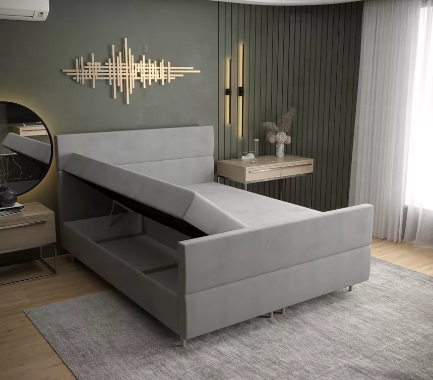 Das Boxspringbett ANGELES PLUS eignet sich für alle modernen Schlafzimmer. Das gepolsterte Kopfteil verhindert ein Verkratzen und Verschmutzen der Wand. Das Bett verfügt über 2 Stauräume, die sich unter den Klapprosten befinden.