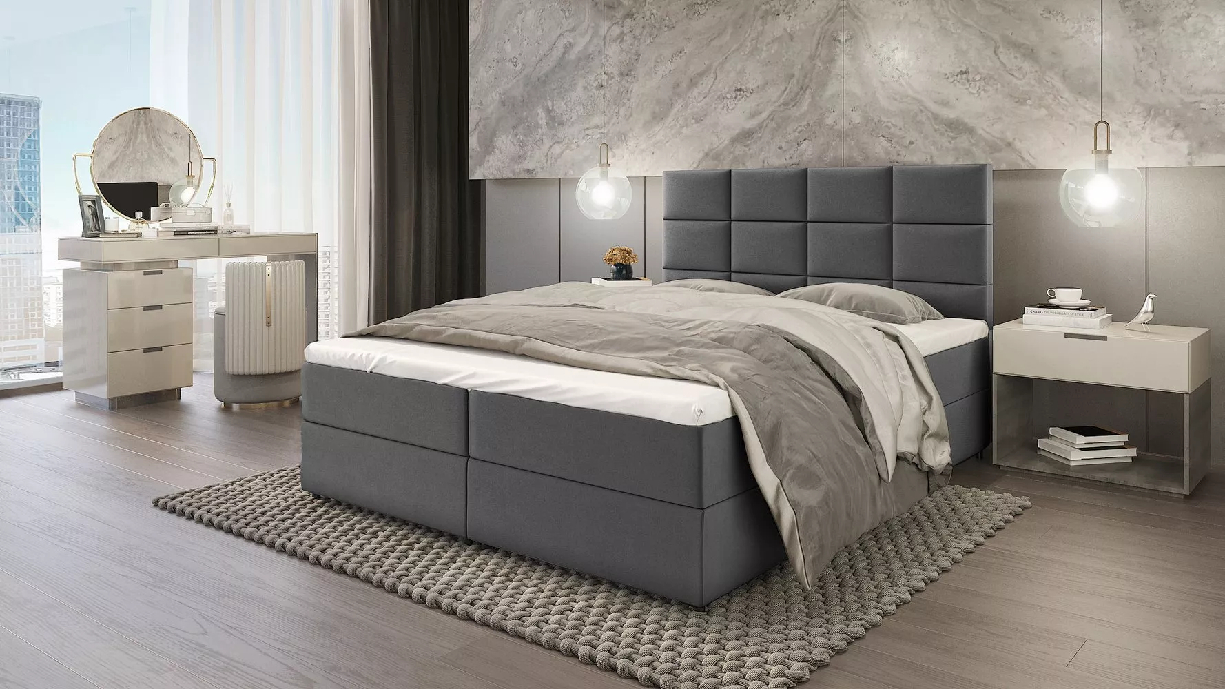 Das bequeme kontinentale Bett GIRA ist mit einem Zweikammer-Stauraum für Bettwäsche ausgestattet. Das hohe gepolsterte Kopfteil sorgt dafür, dass Sie vor dem Schlafengehen bequem ein Buch lesen können und schützt gleichzeitig die Wand vor Schmutz.
