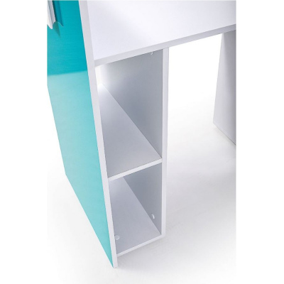 Im unteren Teil befinden sich Stauräume in Form von Regalen und Schubladen. Die Schubladen sind mit einer Aluminiumschiene ausgestattet. Kleidung kann im Bereich mit der Kleiderstange für Kleiderbügel aufbewahrt werden. In den Stufen der Leiter befinden sich ebenfalls Stauräume. Bestandteil ist ein Schreibtisch mit den Maßen H 76 cm, B 88 cm, T 45,5 cm. Beinfreiheit 50 cm.