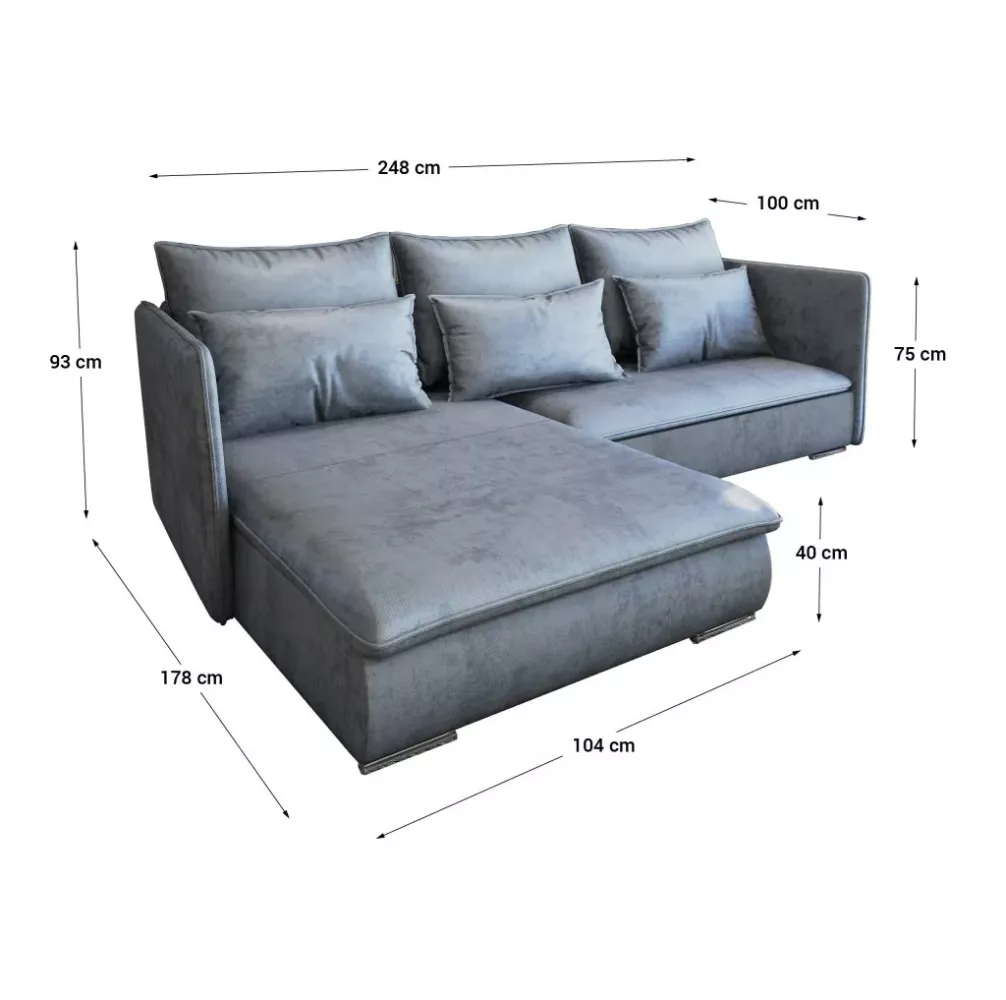 Die Eckcouch RADANA hat einen Stauraum und lässt sich dank seiner Klappfunktion leicht in ein bequemes Bett verwandeln. Der praktische wasserabweisende Bezug reduziert die Aufnahme von verschütteten Flüssigkeiten.