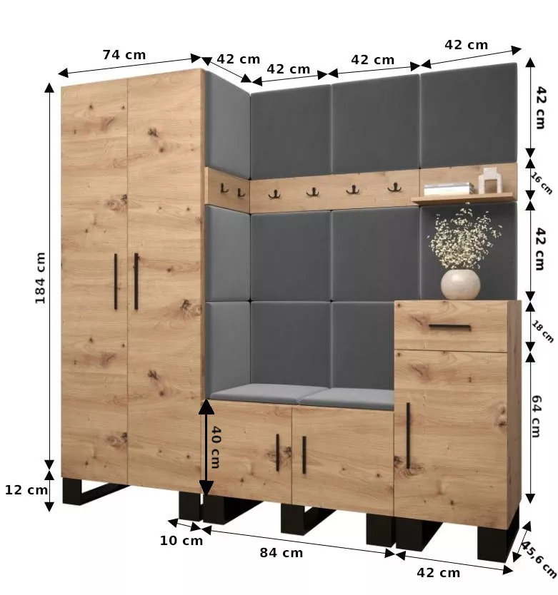 Die moderne Flurwand RUMIE verwandelt den Eingangsbereich in einen gemütlichen und praktisch gestalteten Raum. Sie bietet viel Stauraum und einen guten Komfort beim An- und Ausziehen der Schuhe. Die gepolsterten Paneele sind nicht nur weich und angenehm sondern auch wunderbar dekorativ.