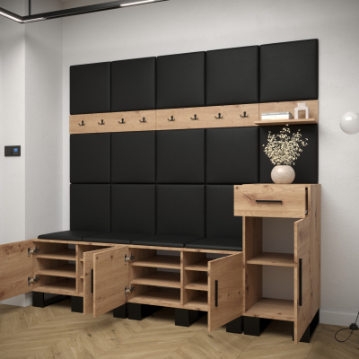 Die moderne Flurwand RUMIE verwandelt den Eingangsbereich in einen gemütlichen und praktisch gestalteten Raum. Sie bietet viel Stauraum und einen guten Komfort beim An- und Ausziehen der Schuhe. Die gepolsterten Paneele sind nicht nur weich und angenehm sondern auch wunderbar dekorativ.