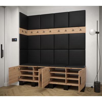 Die moderne Flurwand RUMIE verwandelt den Eingangsbereich in einen gemütlichen und praktisch gestalteten Raum. Sie bietet viel Stauraum und einen guten Komfort beim An- und Ausziehen der Schuhe. Die gepolsterten Paneele sind nicht nur weich und angenehm sondern auch wunderbar dekorativ.