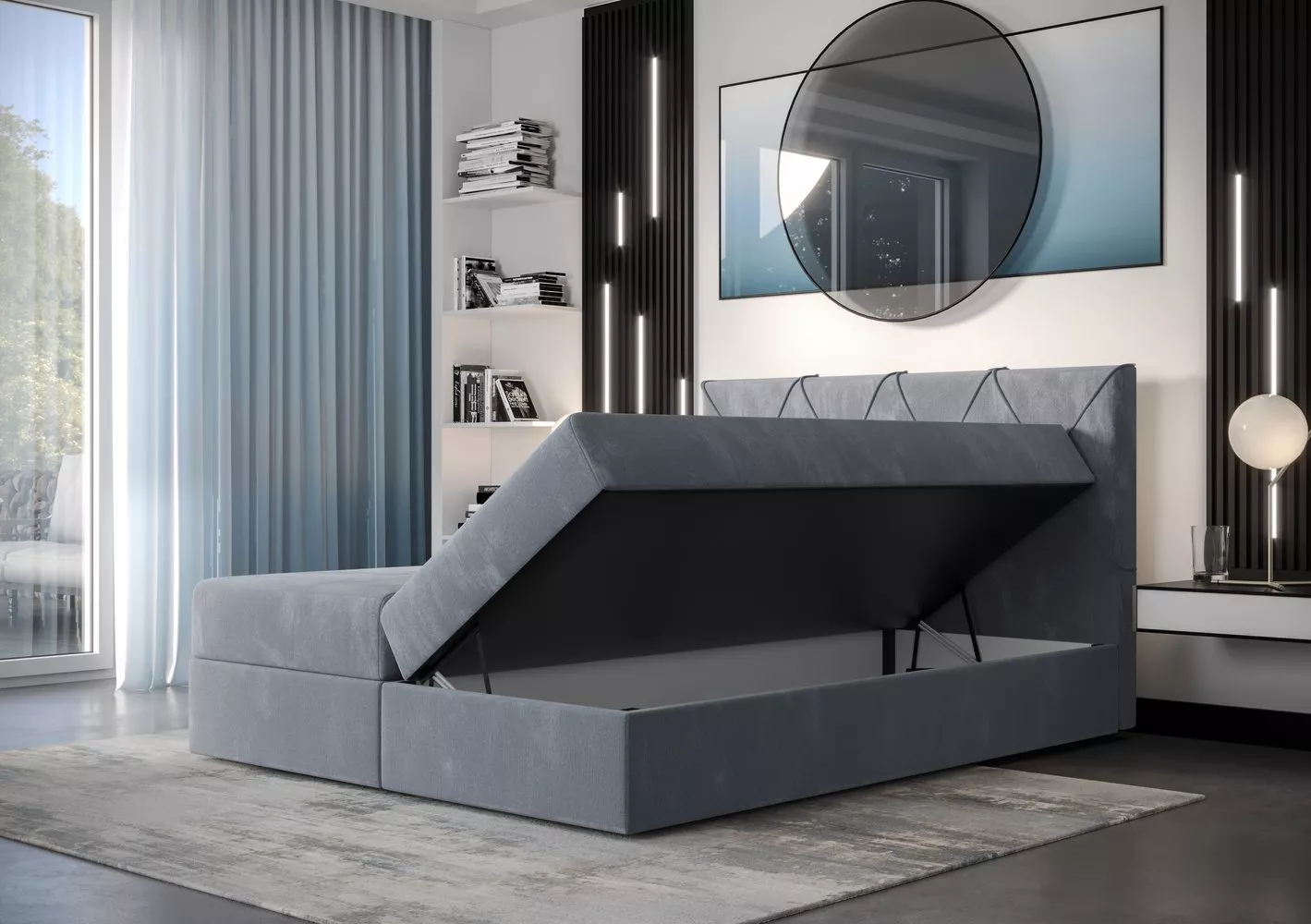 Das Kontinentalbett LILIEN ist mit einem modischen und weichen Kopfteil ausgestattet, das beim Lesen oder Fernsehen für angenehmen Komfort sorgt. Das Bett mit einer Liegefläche von 180x200 cm besteht aus hochwertigen Komponenten, die für einen gesunden Schlaf und ein Gefühl der Entspannung sorgen. Außerdem verfügt es über einen praktische Zweikammer-Aufbewahrung für Bettwäsche.
