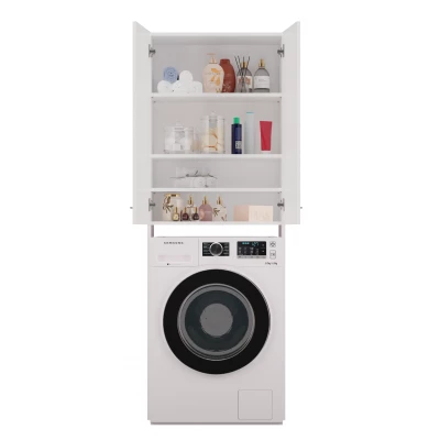 Der hohe Waschmaschinen-Überbauschrank MARGO 2 löst den Platzmangel im Badezimmer, indem er den freien Raum über der Waschmaschine effektiv nutzt. Hinter der Tür des Schränkchens befinden sich geräumige Regalböden, die zur Aufbewahrung von Waschmitteln und Handtüchern genutzt werden können.