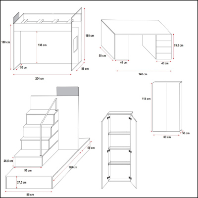 - Das Hochbett verfügt über einen Kleiderschrank und einen Schreibtisch