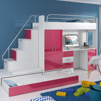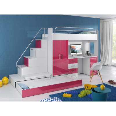 Kinderbett mit Schreibtisch RENI 5 – 80x200, Weiß / Rosa