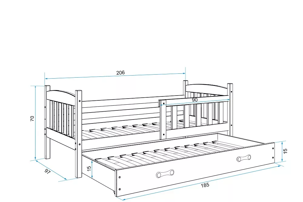 Jedes Bett ist dreimal mit Farben auf Wasserbasis gestrichen und gesundheitlich unbedenklich. Alle Kanten des Bettes sind abgerundet, um auch unseren kleinsten Kunden eine sichere Nutzung zu gewährleisten. Im Lieferumfang ist eine Barriere enthalten, die einen gefährlichen Sturz verhindert.
