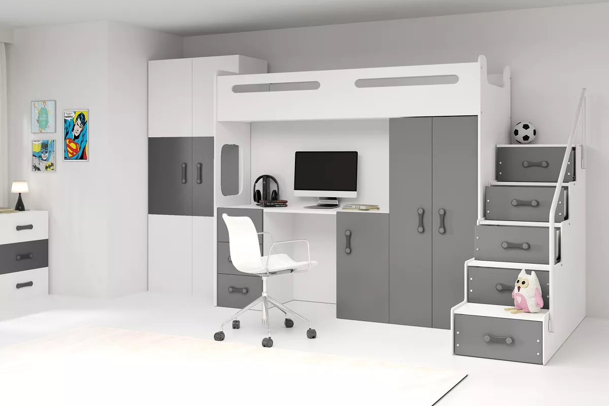 Das Multifunktionsbett für Kinder bietet eine einfache Lösung, wenn Platz zum Schlafen, Spielen und Lernen fehlt. Mit dem Kauf dieses Bettes erhalten Sie eine ganze Reihe weiterer Möbelstücke, wie zum Beispiel einen Schreibtisch, einen Kleiderschrank zur Aufbewahrung von Kleidung, einen kleineren Schrank und einen Regalschrank zur Aufbewahrung von Lehrbüchern sowie eine Leiter mit Stauraum, die je nach Bedarf links oder rechts platziert werden kann.