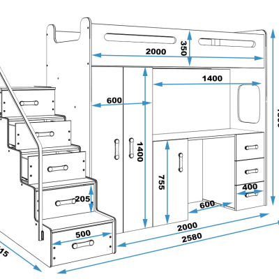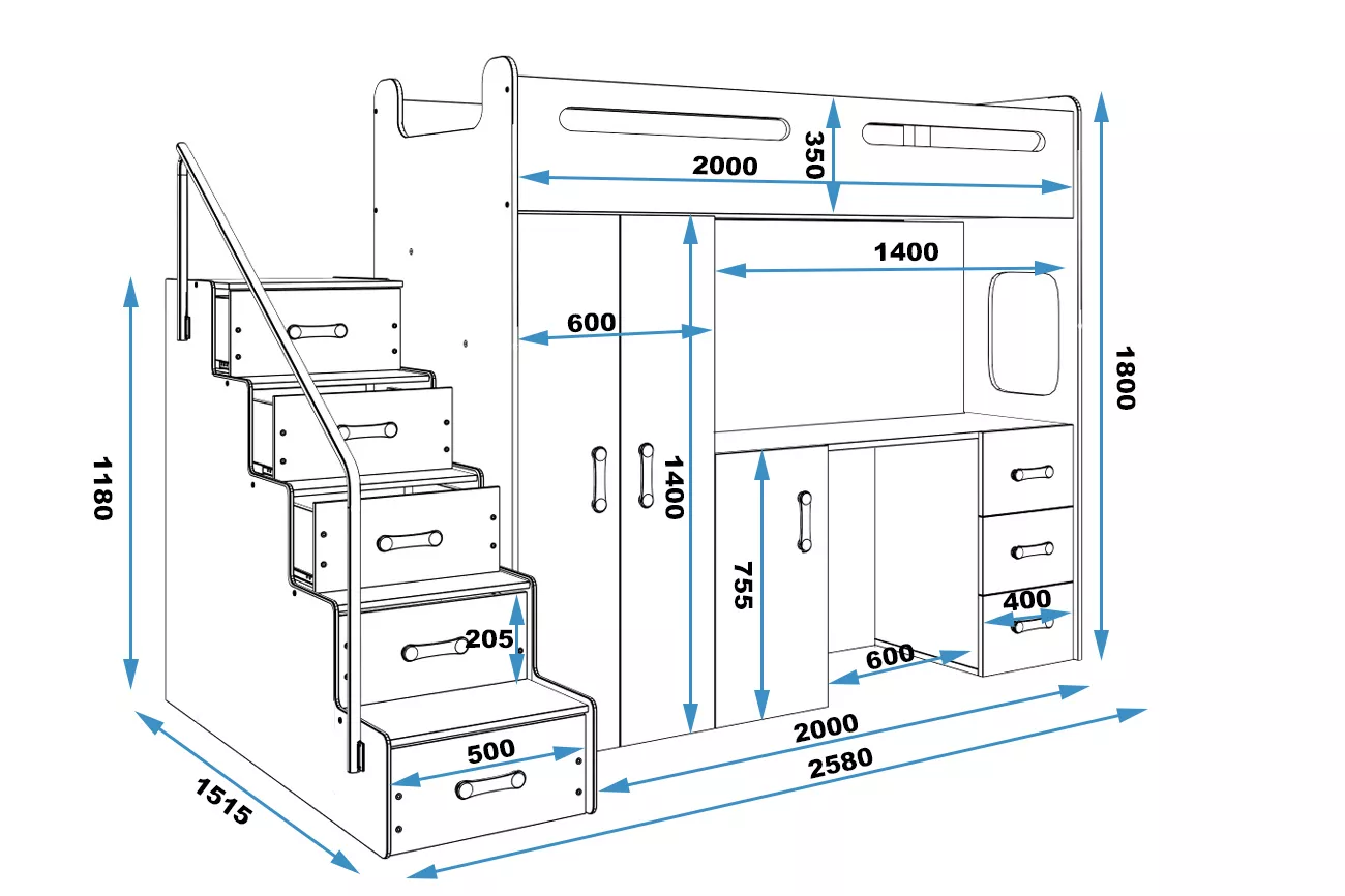 Das Multifunktionsbett für Kinder bietet eine einfache Lösung, wenn Platz zum Schlafen, Spielen und Lernen fehlt. Mit dem Kauf dieses Bettes erhalten Sie eine ganze Reihe weiterer Möbelstücke, wie zum Beispiel einen Schreibtisch, einen Kleiderschrank zur Aufbewahrung von Kleidung, einen kleineren Schrank und einen Regalschrank zur Aufbewahrung von Lehrbüchern sowie eine Leiter mit Stauraum, die je nach Bedarf links oder rechts platziert werden kann.