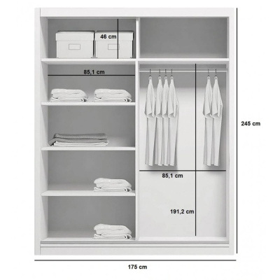 Der zeitlose Kleiderschrank mit einer Breite von 175 cm wird Ihr Interieur perfekt ergänzen. Die Qualität der LTD-Verarbeitung wird auch anspruchsvolle Nutzer erfreuen, die praktischen Schiebetüren werden Sie im Kampf gegen den Platzmangel zu schätzen wissen. Das Angebot zeichnet sich nicht nur durch sein modernes Design, sondern auch durch seine stabile Struktur aus. Im Inneren des Schranks befinden sich Einlegeböden und eine Garderobenstange.