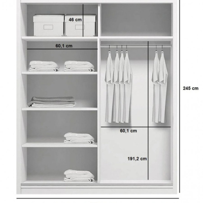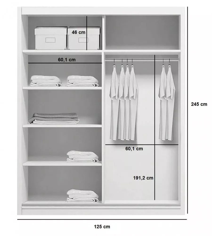 Der zeitlose Kleiderschrank mit einer Breite von 125 cm wird Ihr Interieur perfekt ergänzen. Die Qualität der LTD-Verarbeitung wird auch anspruchsvolle Nutzer erfreuen, die praktischen Schiebetüren werden Sie im Kampf gegen den Platzmangel zu schätzen wissen. Das Angebot zeichnet sich nicht nur durch sein modernes Design, sondern auch durch seine stabile Struktur aus. Im Inneren des Schranks befinden sich Regale und eine Garderobenstange.