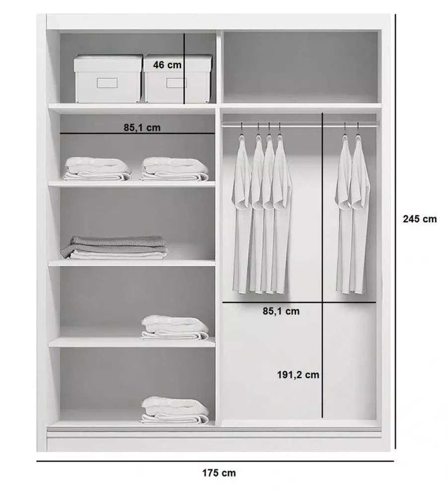 Der Kleiderschrank Hugo ist eine hochwertige Ergänzung für ein modernes Schlafzimmer oder einen Flur. Zusätzlich zu seinem einzigartigen Design bietet er viel Platz für die Aufbewahrung von Kleidung. Der Schrank verfügt über Schiebetüren auf hochwertigen Aluminiumschienen, sodass sich die Tür leicht und mühelos öffnen lässt. Der Schrank verfügt über keine markanten Griffe, die Türen werden mithilfe von Leisten an den Seiten geöffnet. Im Inneren des Schranks befinden sich Regale und eine Garderobenstange.
