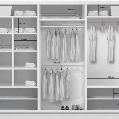 Ein moderner Kleiderschrank, der mit seinem minimalistischen Design in jede Art von Einrichtung passt. Der Schrankkorpus besteht aus einer hochwertigen Schichtstoffplatte. Hinter den drei Schiebetüren befindet sich reichlich Stauraum für Ihre gesamte Kleidung. Der innere Teil ist systematisch in praktische kleinere Abschnitte unterteilt. Sie haben nicht nur eine große Anzahl von Regalen zur Verfügung, sondern auch drei Garderobenstangen, an denen Sie Kleiderbügel aufhängen können. Im mittleren Teil befindet sich ein großer Spiegel, der dem Schrank ein luxuriöseres Aussehen verleiht. Der Schrank verfügt über keine auffälligen Griffe, die Türen werden mithilfe von Metallleisten an den Seiten geöffnet.