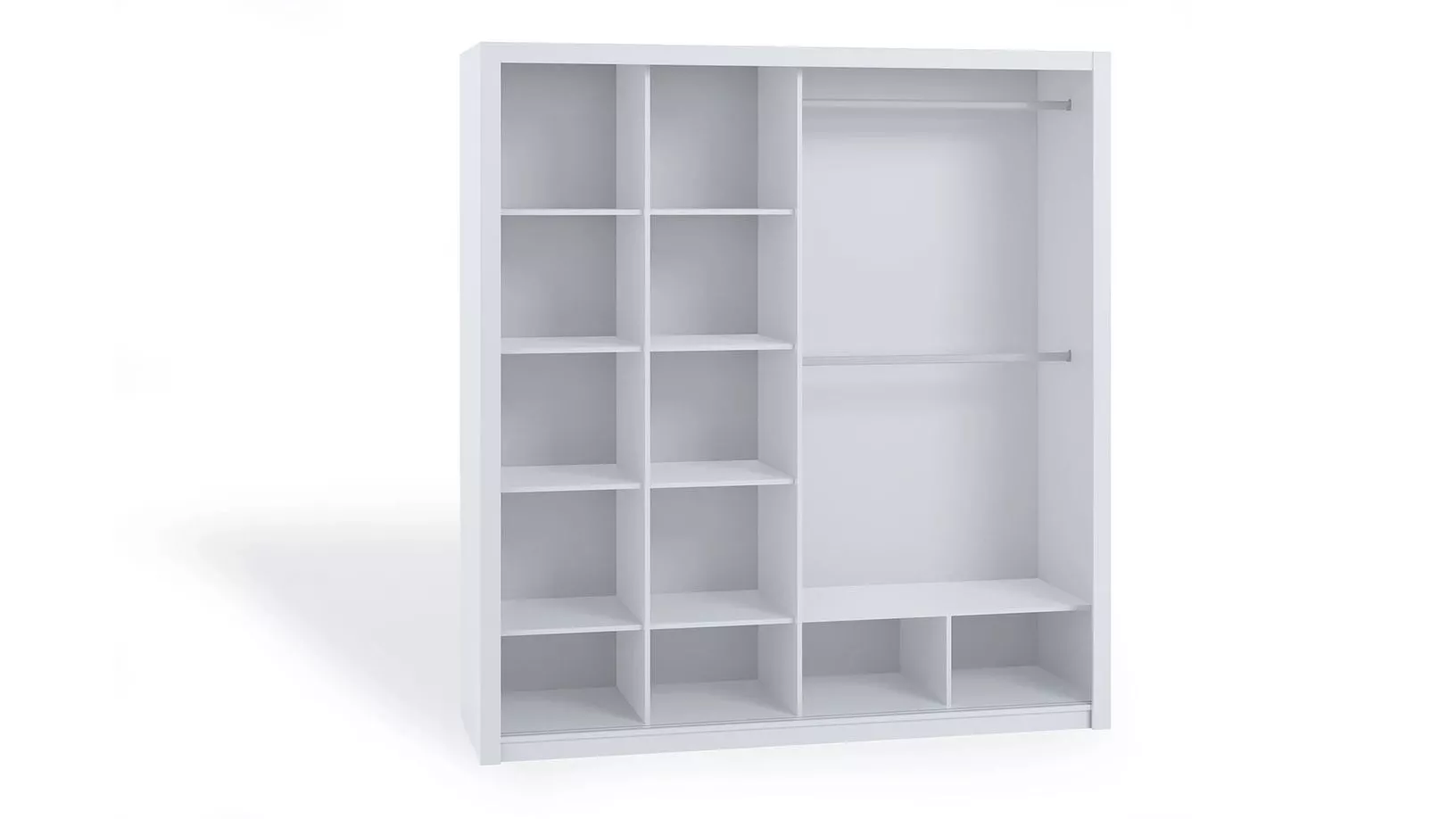 Der Kleiderschrank Bryan besticht durch sein schlichtes Design und passt zu jeder modernen Einrichtung. Im Inneren befinden sich mehrere Regale und zwei Garderobenstangen. Schubladen für den Schrank können weiter unten gekauft werden.
