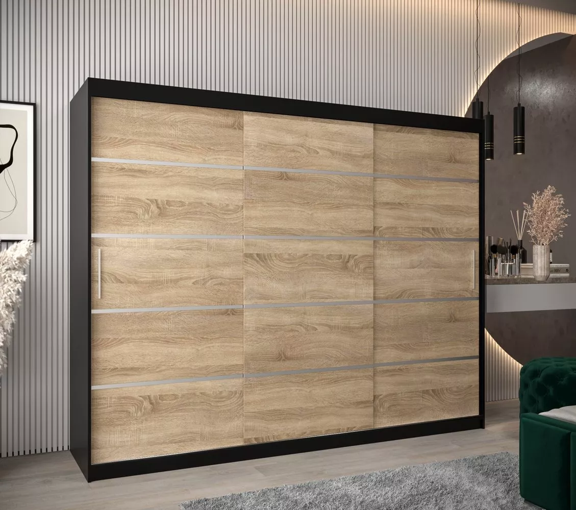 Kleiderschrank ENNI – Breite 250 cm, schwarz / Eiche sonoma