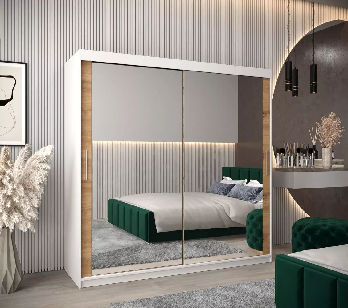Schwebetürenschrank mit einer Breite von 200 cm TIMEA 3 – Weiß / Eiche Artisan