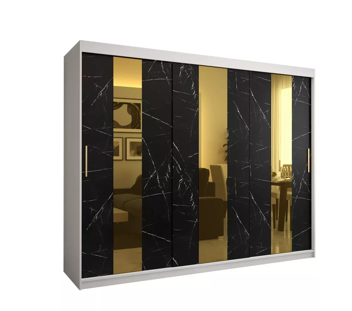 Designer-Kleiderschrank mit goldenem Spiegel MADLA 4 – Breite 250 cm, Weiß / Schwarz