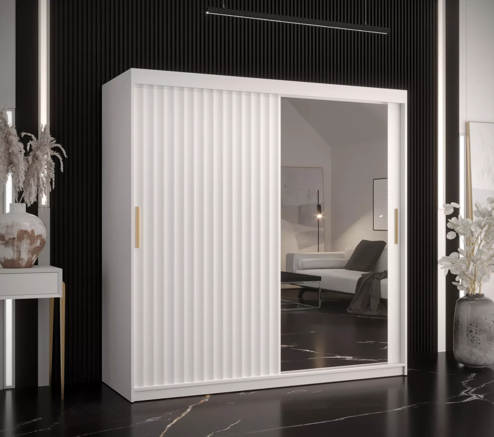 Der Kleiderschrank RADKIN 2 mit Spiegel besticht durch stilvolle Türen mit Rillen. Er verfügt über 9 Einlegeböden, 2 Garderobenstangen und einen Spiegel.