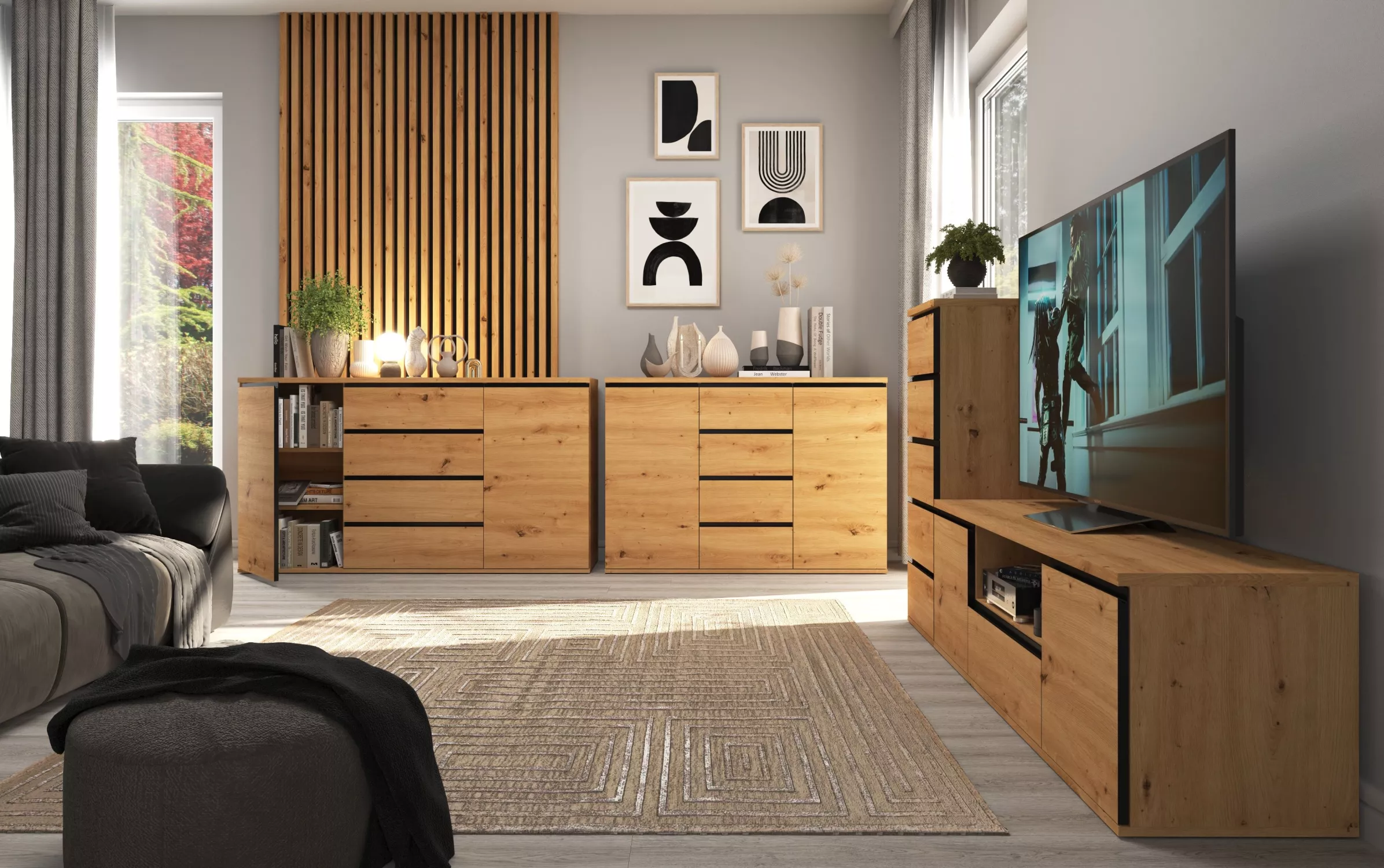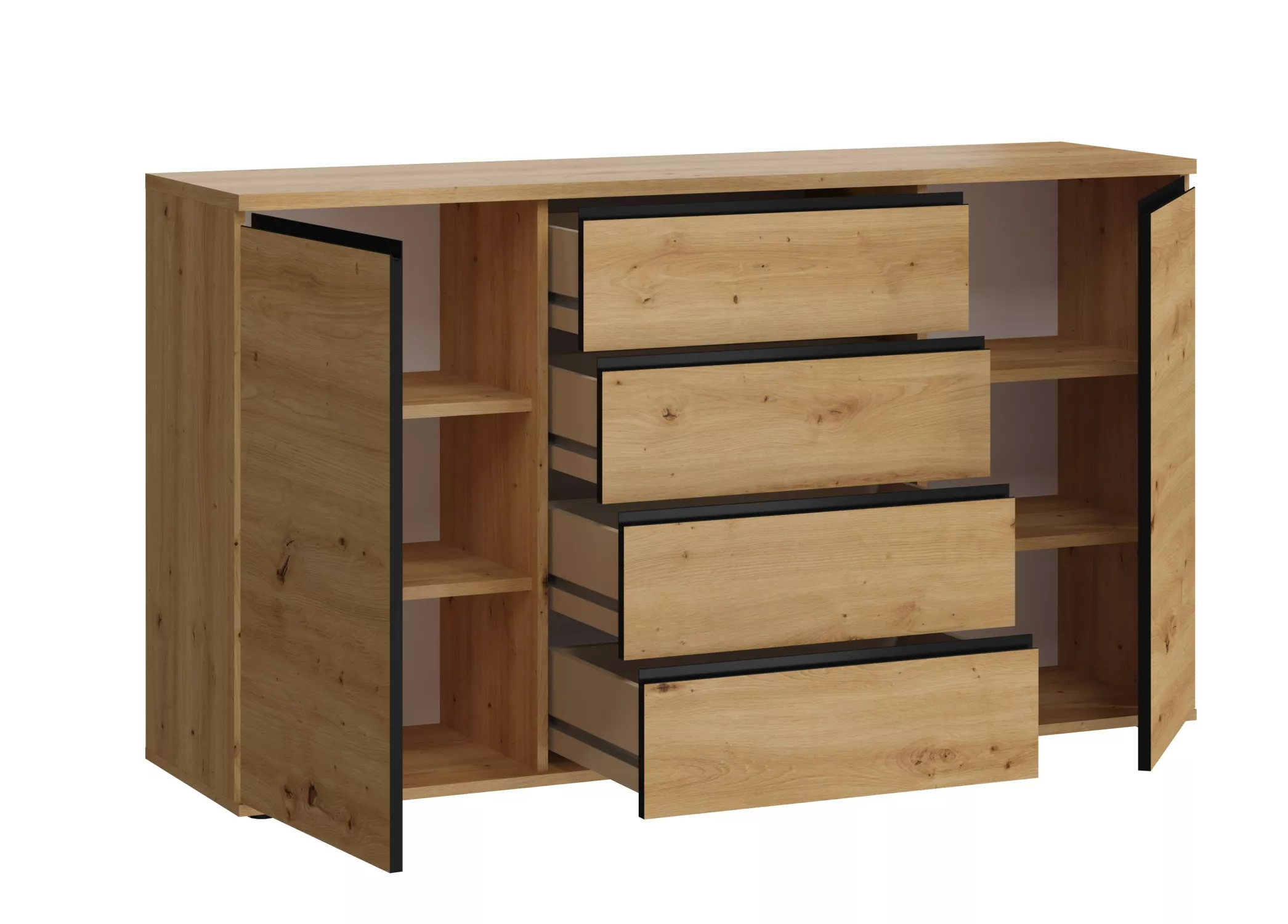 Die breite HERA-Kommode passt perfekt in ein modernes Interieur. Die Kombination aus warmen Holztönen und schwarzen Elementen verleiht dem Interieur einen Designercharakter. Die Kommode verfügt über vier Schubladen und Seitenschränke mit Einlegeböden.