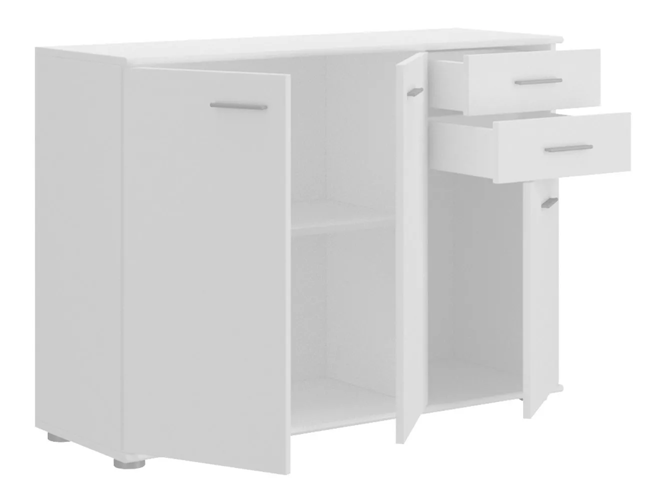 Die Kommode Michala ist aus hochwertigem Laminat gefertigt. Die Aufbewahrung besteht aus einer Kombination aus drei kleinen Schränken mit Türen und zwei Schubladen. Die Türen und Schubladen verfügen über schmale Griffe. Auch die Oberseite der Kommode bietet ausreichend Platz.