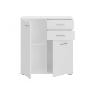 Die kombinierte Kommode Michala ist aus hochwertigem Laminat gefertigt. Der Stauraum besteht aus einer Kombination von zwei kleinen Schränkchen mit Türen und zwei Schubladen. Die Türen und Schubladen sind mit schmalen Griffen versehen. Auch die Oberseite der Kommode bietet viel Platz.