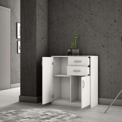 Die Kommode IBOJA ist dank der Türen und Schubladen sehr elegant und zugleich praktisch. Die ausreichend große Aufbewahrung können Sie zum Verstauen von Kleidung oder anderen Dingen nutzen.