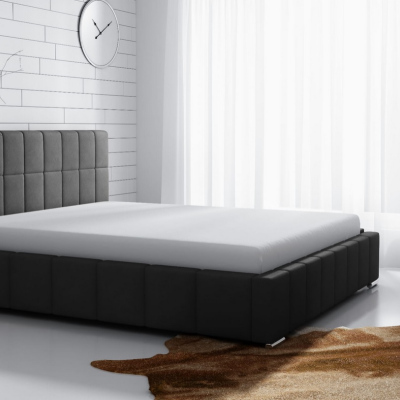 Gepolstertes Doppelbett Flek. Modernes Design und einfache Linien. Das luxuriöse Kopfteil erreicht eine Höhe von 110 cm und lädt zum bequemen Anlehnen beim Lesen, Fernsehen oder Arbeiten am PC am Abend ein. Die Bettstirn ist angenehm weich und mit feiner Steppung verziert. Die silbernen Metallbeine verleihen dem Bett Anmut und Flair. Den Lattenrost und die Matratze zum Nachkaufen finden Sie weiter unten.