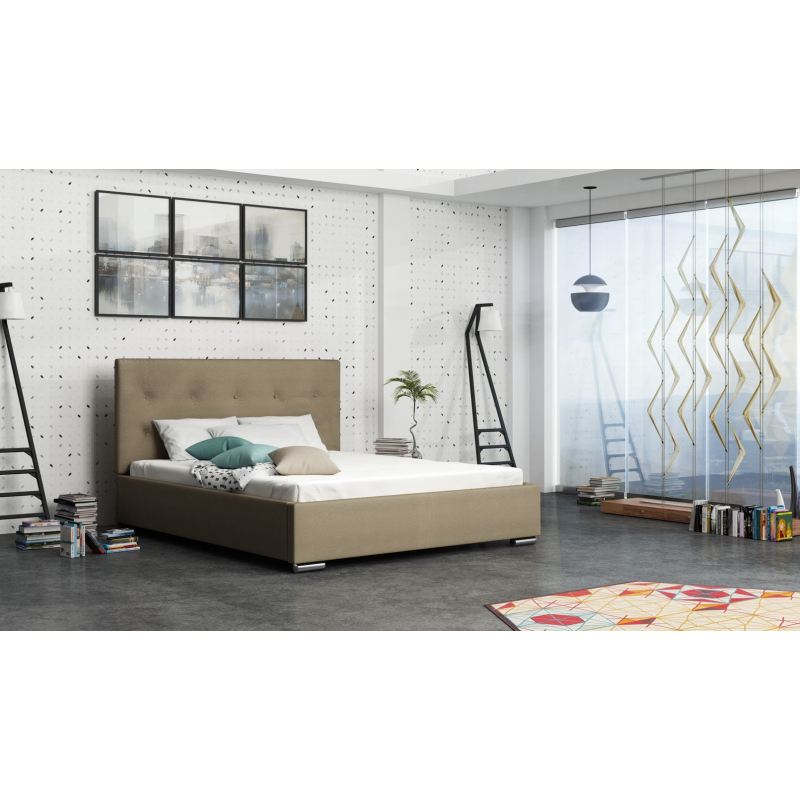 Gepolstertes Doppelbett Flek. Modernes Design und einfache Linien. Das luxuriöse Kopfteil erreicht eine Höhe von 110 cm und lädt zum bequemen Anlehnen beim Lesen, Fernsehen oder Arbeiten am PC am Abend ein. Die Bettstirn ist angenehm weich und mit feiner Steppung verziert. Die silbernen Metallbeine verleihen dem Bett Anmut und Flair. Den Lattenrost und die Matratze zum Nachkaufen finden Sie weiter unten.