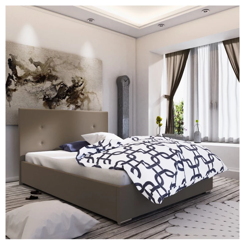 Das Ehebett mit Stauraum FLEK 3 eignet sich für alle modernen Schlafzimmer. Das gepolsterte Kopfteil verhindert Kratzer und Verunreinigungen an der Wand. Das Bett verfügt über einen Stauraum unter dem aufklappbaren Lattenrost.