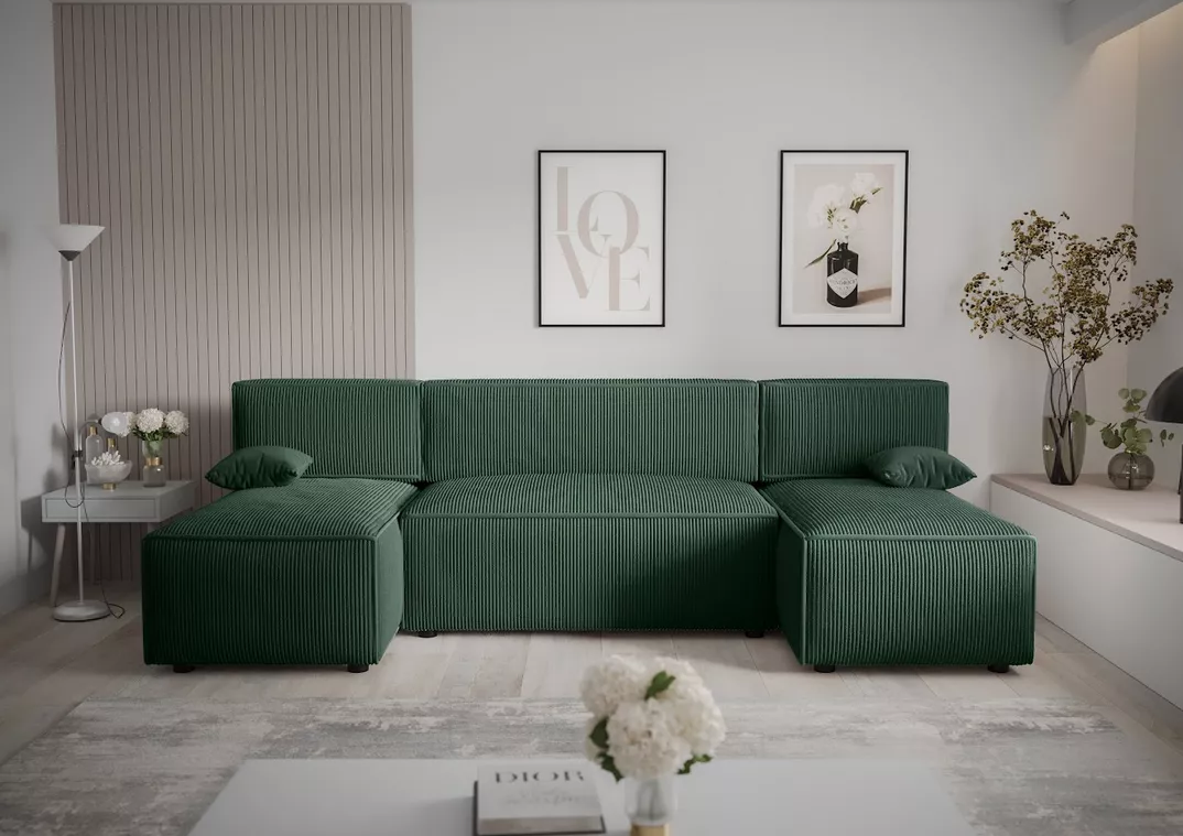 Die U-förmige Schlaf Couchgarnitur RADANA U ist für alle modernen Wohnzimmer geeignet. Dank der Klappfunktion können Sie das Sofa in Sekundenschnelle in ein geräumiges Bett verwandeln.