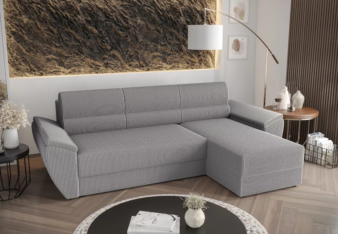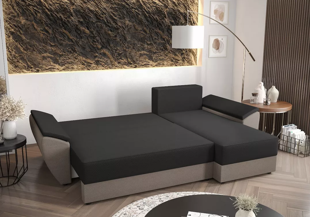 Das ausziehbare Ecksofa OPHELIA eignet sich für alle modernen Wohnzimmer. Dank der Klappfunktion können Sie das Sofa in Sekundenschnelle in ein geräumiges Bett verwandeln. Es hat einen Stauraum.