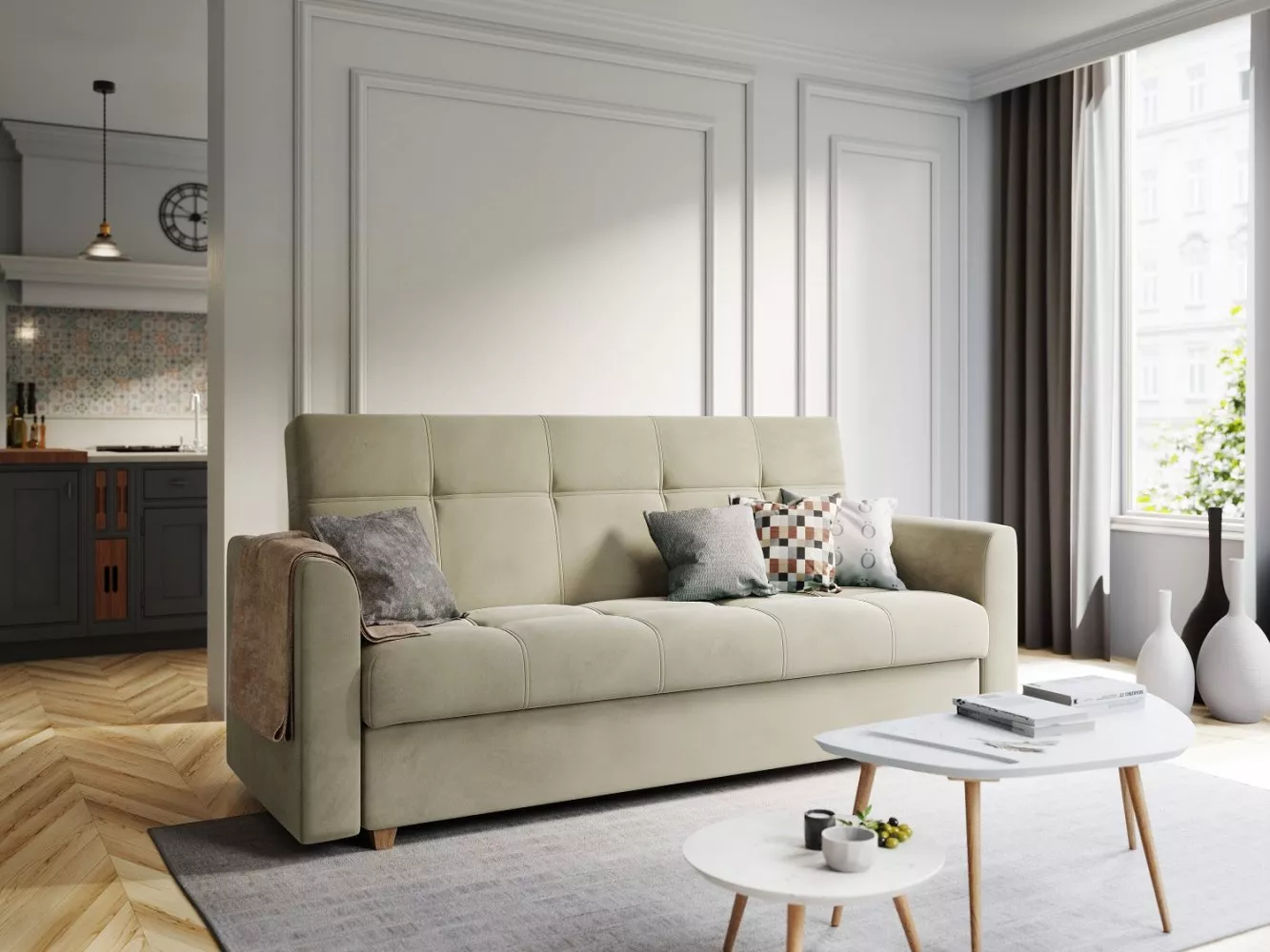 Das Larsen Sofa sieht elegant aus und bietet reichlich Platz. Es besticht durch schlichtes Aussehen, elegante Polsterung und feine Nähte. Das Sofa verfügt über einen Stauraum, der sich leicht zu einem Bett ausklappen lässt. Es ist mit einem hochwertigen Stoff mit erhöhter Schmutzresistenz bezogen.