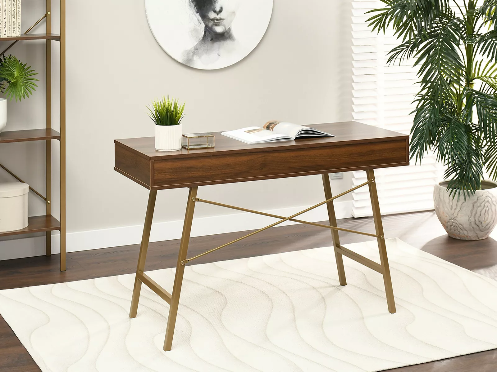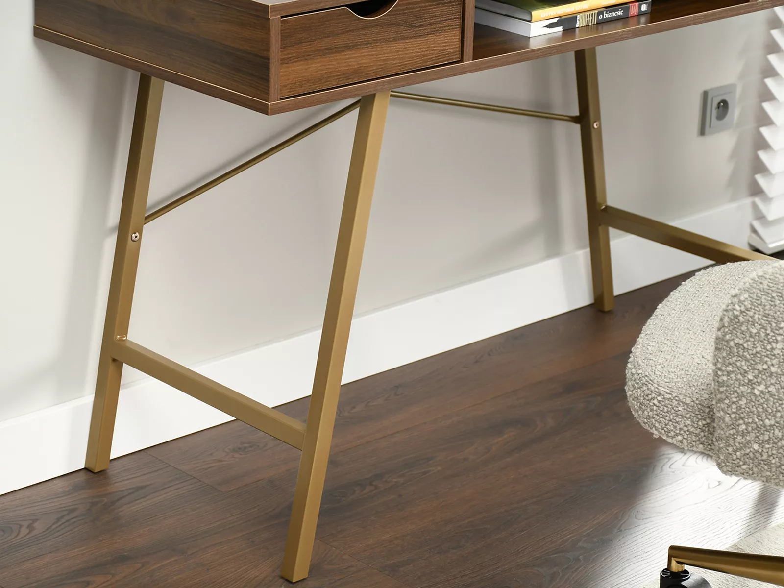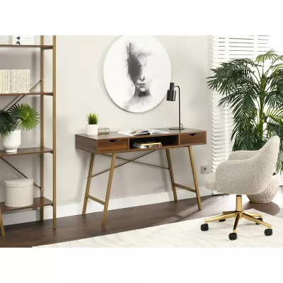 Der Schreibtisch DEVON verfügt über ein geräumiges Regal zwischen 2 großen Schubladen. Der Tisch ist aus einer sehr stabilen Metallkonstruktion gefertigt.