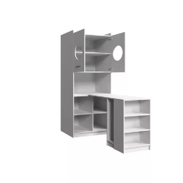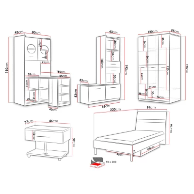 Die RENI Kinderzimmermöbel sind ein funktionelles Set, das Minimalismus und Modernität kombiniert. Die hellen Farben der einzelnen Elemente des Sets werden durch ein dekoratives Muster ergänzt. Das Set besteht aus 5 Elementen, die reichlich Stauraum und eine bequeme Ecke zum Lernen und für Hausaufgaben bieten. Das erste Element des Sets ist ein Kleiderschrank mit einer Breite von 120 cm. Die innere Aufteilung des Schranks besteht aus einer Garderobenstange und tiefen Regalböden, die eine einfache Trennung der Alltagsgegenstände ermöglichen. Das stilvolle Regal ist nicht nur mit Regalböden, sondern auch mit einem geschlossenen Schrank und zwei Schubladen ausgestattet. Dank der geräumigen offenen Regale kann es auch als Bücherregal dienen. Ein weiteres Element des Sets ist ein Schreibtisch mit einem Regal. Das Eckschreibtisch-Layout vergrößert Ihre Arbeitsfläche auf vorteilhafte Weise, so dass Sie Ihren Computer dauerhaft auf der Platte platzieren können, ohne dass Ihr Arbeitsbereich eingeschränkt wird. Der Tisch kombiniert geschlossene Regale mit offenem Raum mit vielen Fächern zur Aufbewahrung notwendiger Bücher und Schulsachen. An der Seite des Tisches befinden sich mehrere geräumige Ablageflächen, dank derer alle notwendigen Gegenstände griffbereit sind. Der Nachttisch ist der perfekte Ort, um vor dem Schlafengehen benötigte Accessoires wie eine Nachttischlampe oder eine Tasse heißen Kakao abzustellen. Das letzte Element des Sets ist ein Bett mit einer Liegefläche von 90x200 cm. Das Kopfteil des Bettes ist aus einer MDF-Platte in glänzender Farbe gefertigt. Der moderne Stil wird durch die leicht angewinkelte Orientierung der Frontplatte ergänzt. Das Bett bietet Stauraum in Form einer 120x80 cm großen Schublade.