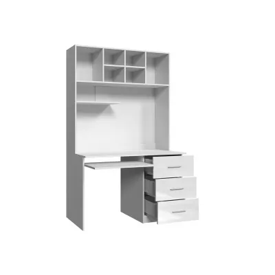 Die RENI Kinderzimmermöbel sind ein funktionelles Set, das Minimalismus und Modernität kombiniert. Die hellen Farben der einzelnen Elemente des Sets werden durch ein dekoratives Muster ergänzt. Das Set besteht aus 5 Elementen, die reichlich Stauraum und eine bequeme Ecke zum Lernen und für Hausaufgaben bieten. Das erste Element des Sets ist ein Kleiderschrank mit einer Breite von 120 cm. Die innere Aufteilung des Schranks besteht aus einer Garderobenstange und tiefen Regalböden, die eine einfache Trennung der Alltagsgegenstände ermöglichen. Das Eckregal verfügt über Einlegeböden, die zum Ausstellen von Spielzeug, Büchern oder Souvenirs genutzt werden können. Der Schreibtisch mit Regal wurde so konzipiert, dass er ausreichend Platz für die Aufbewahrung von Lernmaterial bietet. Der Schreibtisch verfügt über eine ca. 53 cm tiefe Arbeitsplatte und eine ausziehbare Tastaturschublade. Im unteren Teil des Tisches befinden sich drei Schubladen, im oberen Teil zahlreiche Ablagen für Bücher und kleines Zubehör. Der Nachttisch ist der perfekte Ort, um vor dem Schlafengehen benötigte Accessoires wie eine Nachttischlampe oder eine Tasse heißen Kakao abzustellen. Das letzte Element des Sets ist ein Bett mit einer Liegefläche von 90x200 cm. Das Kopfteil des Bettes ist aus einer MDF-Platte in glänzender Farbe gefertigt. Der moderne Stil wird durch die leicht angewinkelte Orientierung der Frontplatte ergänzt. Das Bett bietet Stauraum in Form einer 120x80 cm großen Schublade.