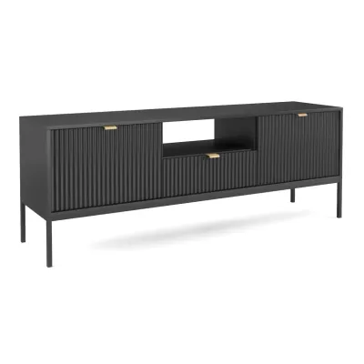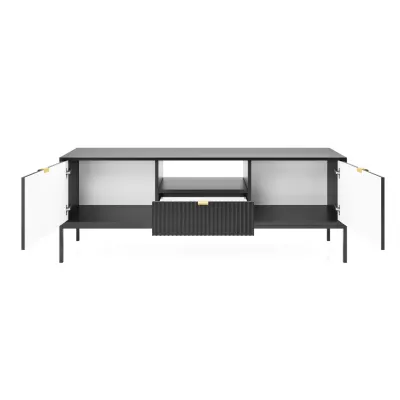 Der MISHEEL Fernsehtisch ist mit geschlossenen Schränken, einer Schublade und einem offenen Regal zur Aufbewahrung einer Set-Top-Box oder einer Spielkonsole ausgestattet. Hohe Metallbeine, modische Lamellen und goldfarbene Griffe sind charakteristische Merkmale des Tisches.