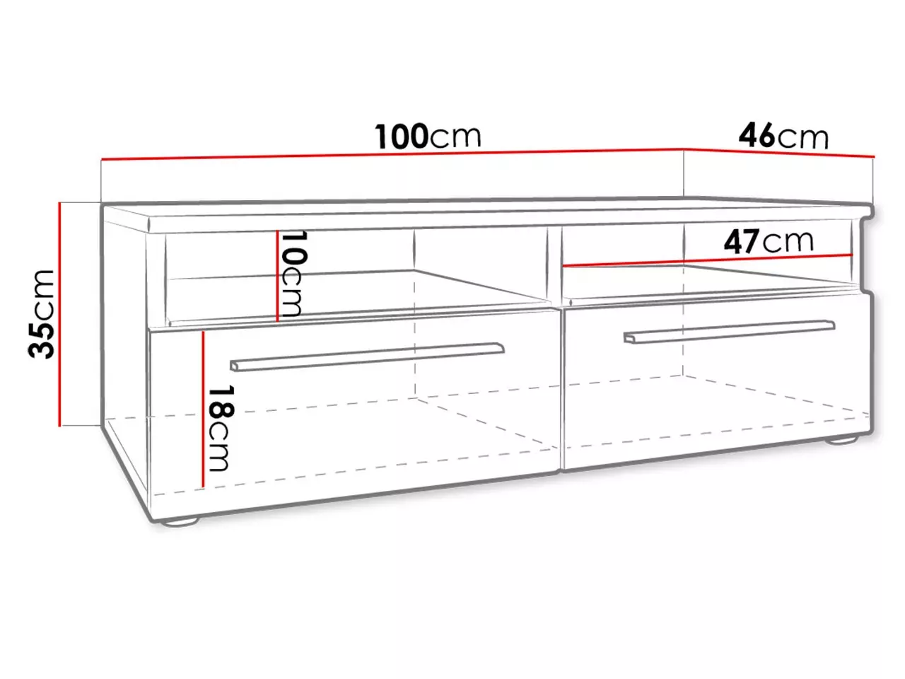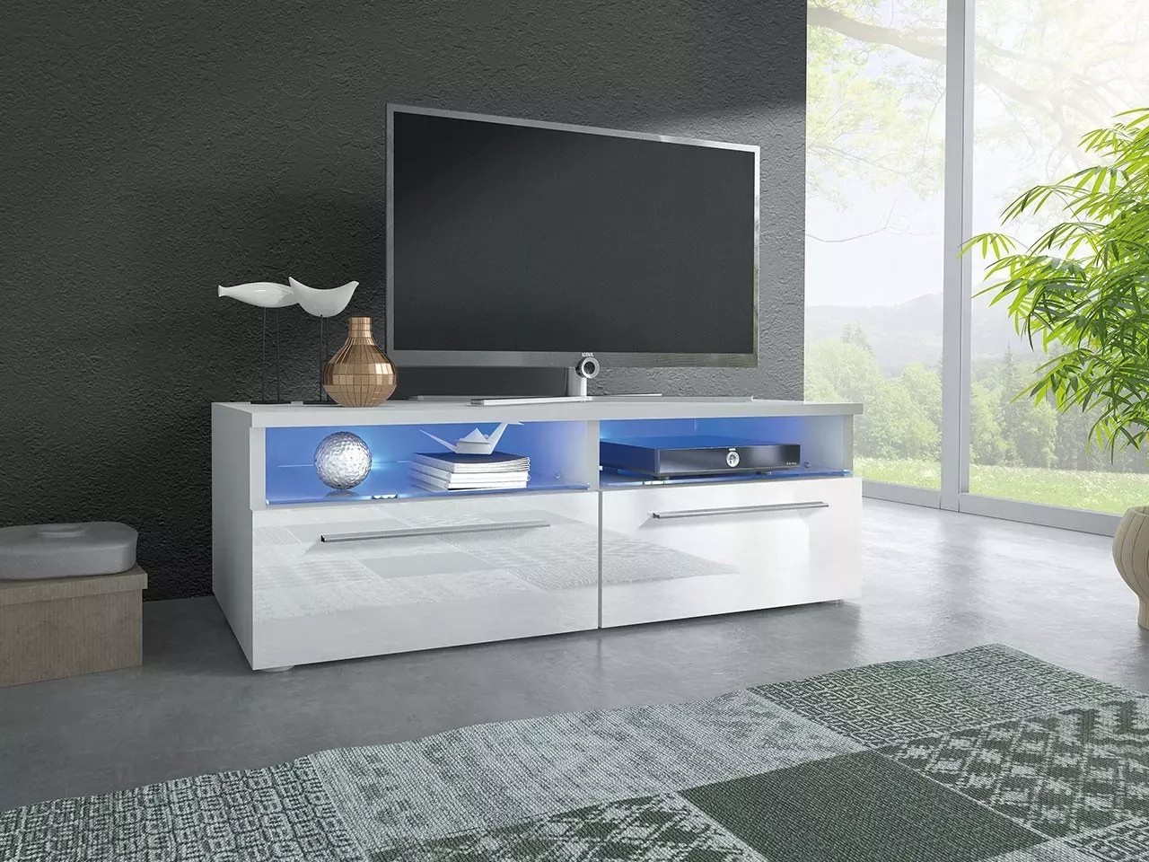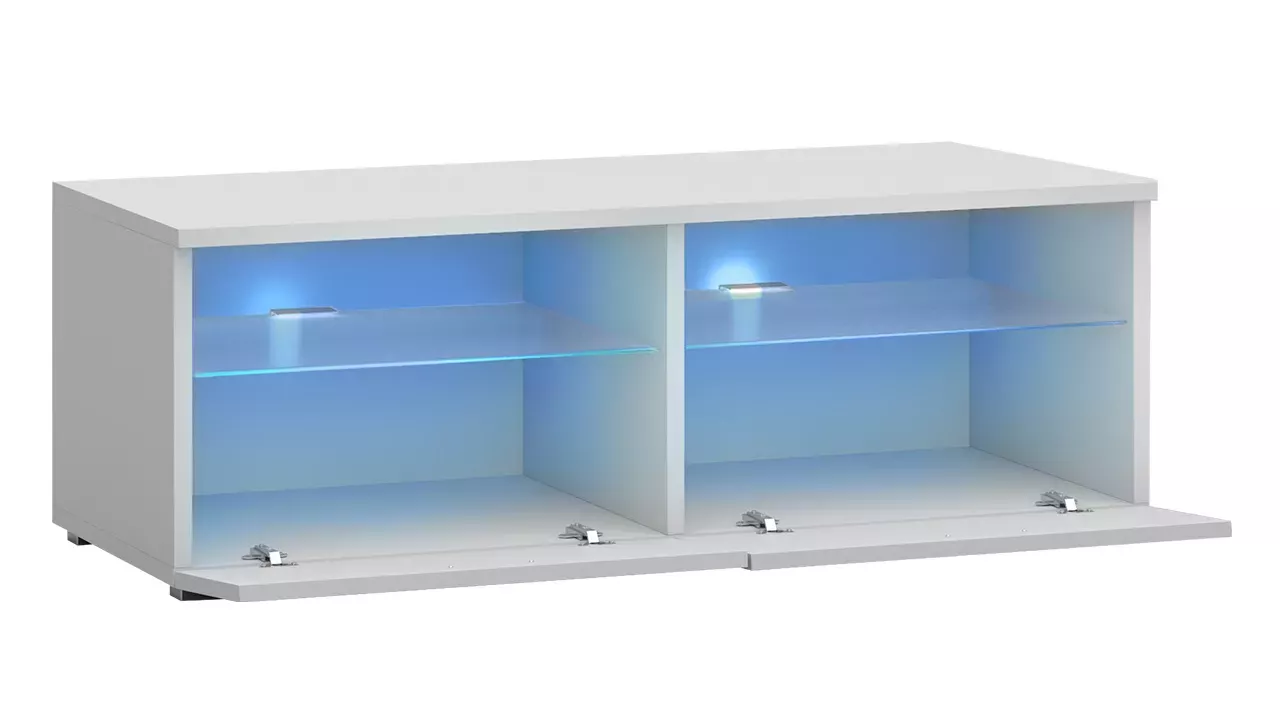 Der TV-Ständer ist mit einer blauen LED-Beleuchtung ausgestattet, die dem Interieur einen modernen Charakter verleiht.