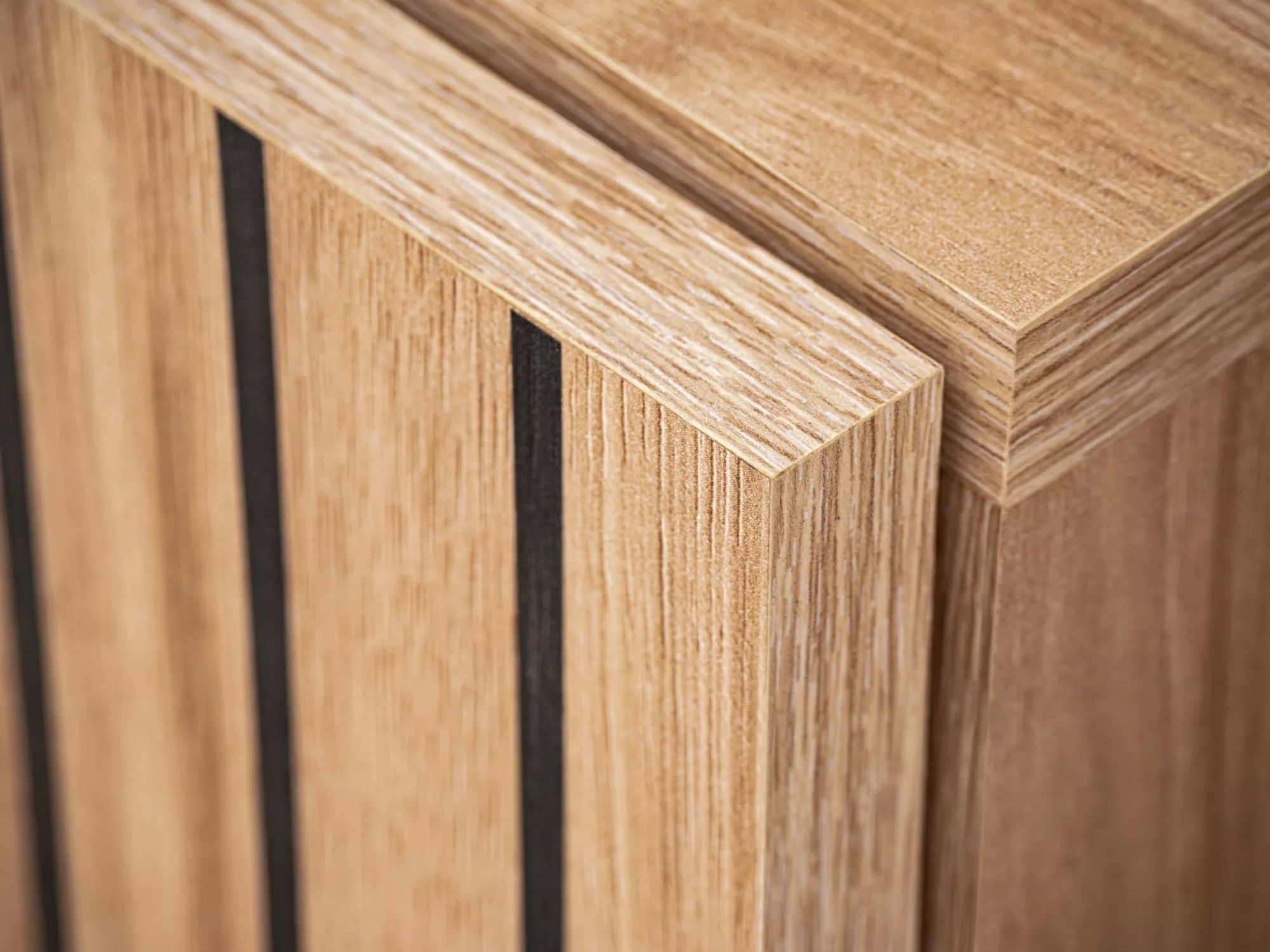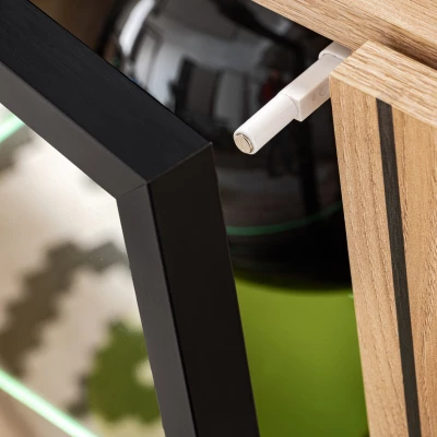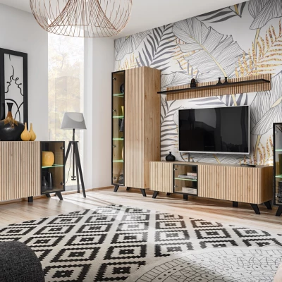 Der DEJANA Fernsehtisch für das Wohnzimmer hat 3 Schränkchen und einen verglasten Teil mit Innenbeleuchtung. Das Ganze ist im history jackson Dekor gehalten, wobei das Glas im mittleren Teil des Tisches in einer schwarzen Zarge aus Aluminium eingefasst ist.