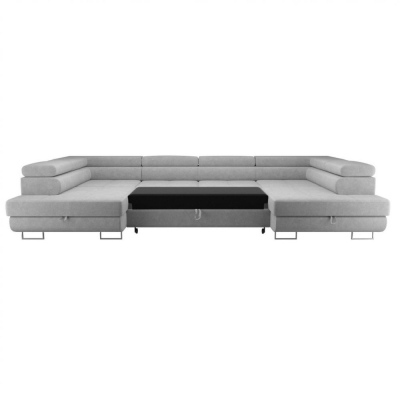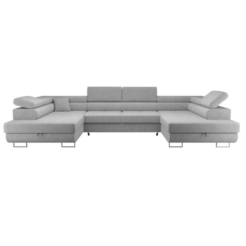 Die U-förmige Schlafcouch aus der Wilfred Kollektion hat 2 Stauräume für Bettzeug. Standard ist die Schlaffunktion. Delphin-Klappmechanismus. Kopfstützen mit 4 Verstellstufen. Hochwertiges Monolith-Gewebe, das sich angenehm anfühlt und zusätzlich mit einer hydrophoben Schicht versehen ist, die die Flüssigkeitsaufnahme reduziert. Je nach Einfallswinkel des Lichts wird das Material schattiert, was ein charakteristisches Merkmal von Veloursstoffen ist.