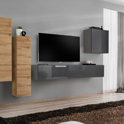 Die Wohnwand HARPER besteht aus 2 Schränken, einem Regal und einem TV-Schrank. Die Wand kann aufgehängt oder aufgestellt werden.