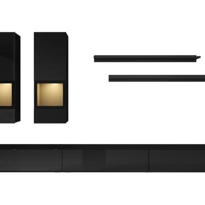 Die Wohnwand Annemarie ist ein Angebot, das jeden Wohnraum bereichert. Die glänzende schwarze Farbe der Vorderteile verleiht der Komposition Charakter. Der breite TV-Schrank mit aufklappbarer Front ist ein idealer Ort zum Sortieren der Accessoires des täglichen Gebrauchs. Das Angebot umfasst zwei Hängevitrinen mit der Möglichkeit der LED-Beleuchtung, zwei einfache Regale und einen Schrank unter dem Fernseher. Das Ganze ist ein modernes Möbelset für das Wohnzimmer, das einen innovativen Raum schafft.